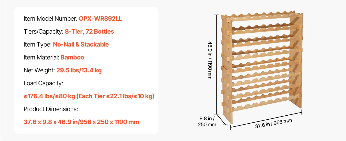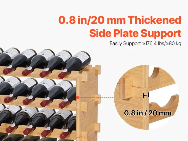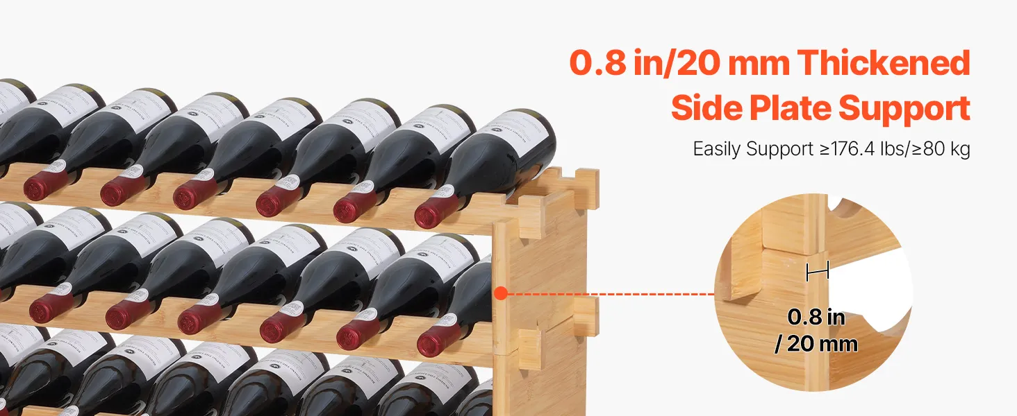Struttura stabile: grazie ai pannelli laterali spessi 20 mm (0,8 pollici), che si adattano e senza spazi vuoti, il nostro portabottiglie indipendente offre un supporto sicuro. Può sostenere 80 kg (10 kg per ripiano) senza oscillare