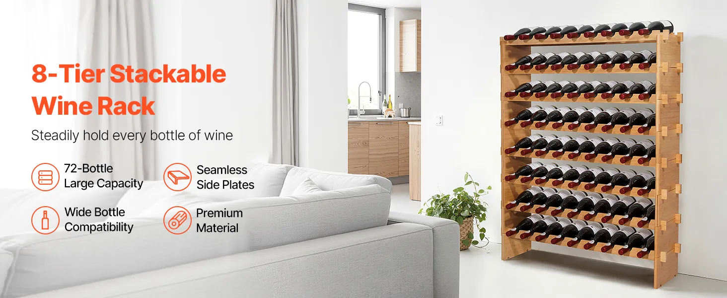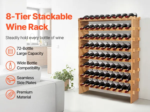 VEVOR Scaffale Autoportante Portabottiglie per Cucina per 72 Bottiglie 8 Ripiani, con Capacità di Carico Totale di 80 kg, Anti-oscillazione, Porta Bottiglie da Pavimento per Cantina, Bar