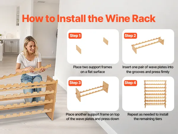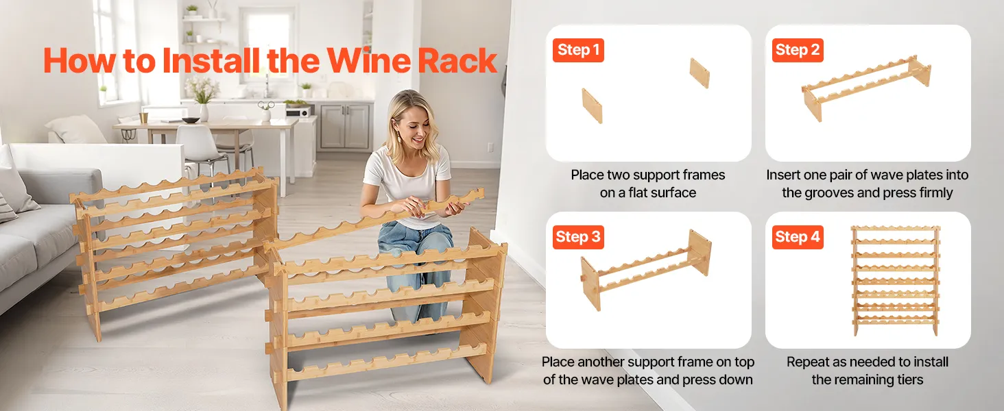 Il nostro portabottiglie è dotato di istruzioni di montaggio dettagliate: non sono necessari attrezzi o viti aggiuntivi. Basta allineare le tacche e le scanalature e premerle insieme. Anche i principianti possono completare il montaggio in pochi minuti.