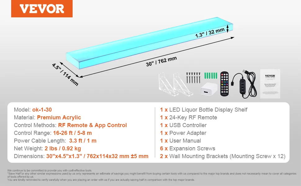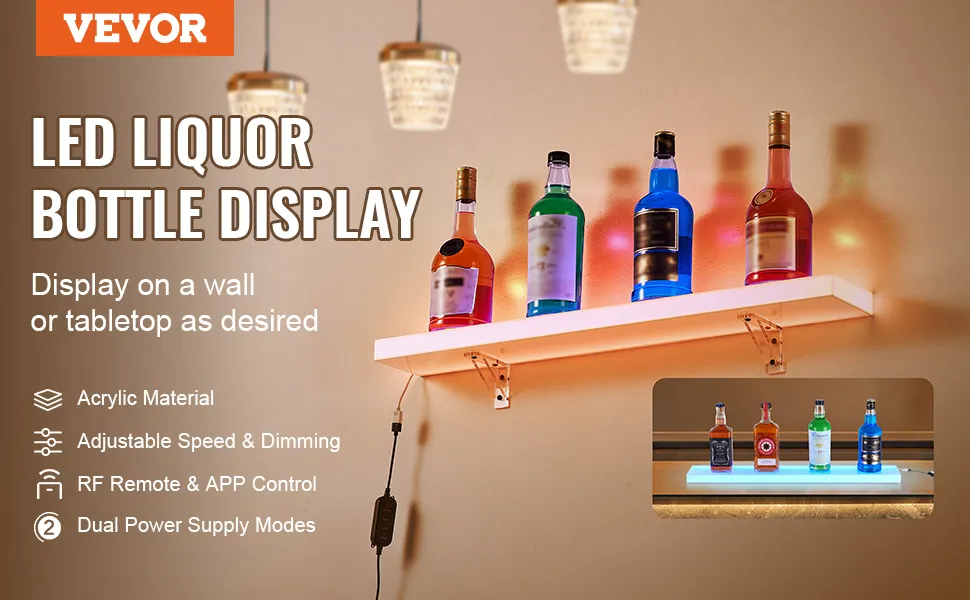 VEVOR Mensola per Vino da Bar, Mensola per Mostrare Vino Illuminata a LED Telecomando RF Controllo APP, Scaffale Illuminazione per Bevande in Acrilico 1 Ripiano, Portabottiglie da Parete/Tavolo