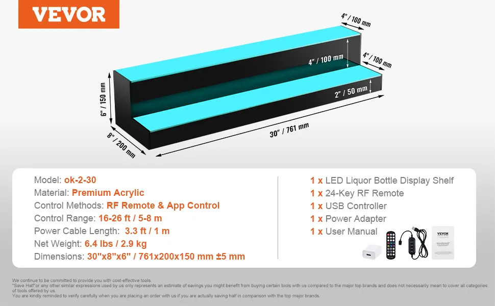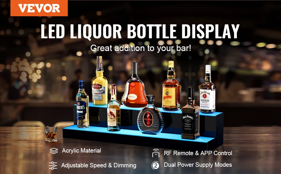 VEVOR Scaffale Portabottiglie di Vino da Bar, Scaffale da Bar Illuminato a LED Telecomando RF Controllo APP, Scaffale Illuminazione per Bevande in Acrilico 2 Ripiani, Portabottiglie 761x200x150mm