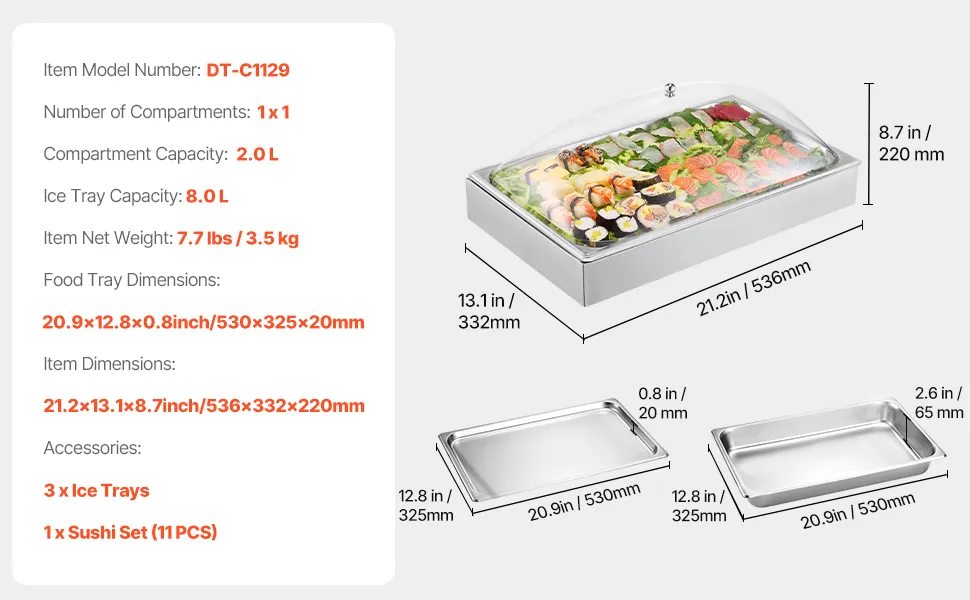 Set elegante e pratico: il nostro espositore per dispensatori di condimenti a buffet include 3 vaschette per ghiaccio e un set per sushi da 11 pezzi. Offre praticità ed eleganza, rendendo le esperienze culinarie più comode ed eleganti