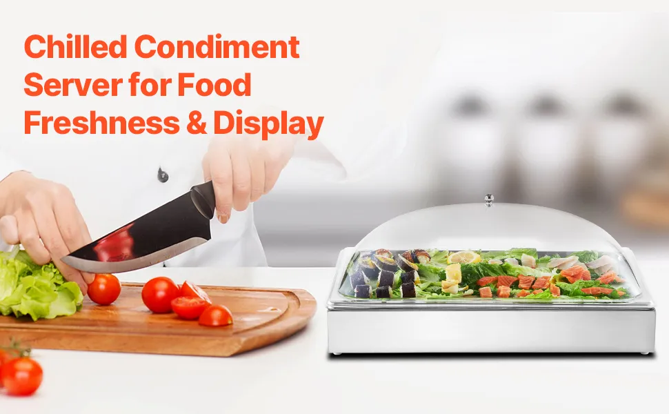 Ampia gamma di utilizzi: ideale per qualsiasi ambiente, sia al chiuso che all'aperto. Il nostro server per buffet di cibi freddi è adatto per pasti in famiglia, feste, picnic, barbecue e campeggio, garantendo una conservazione superiore degli alimenti e una bella esposizione