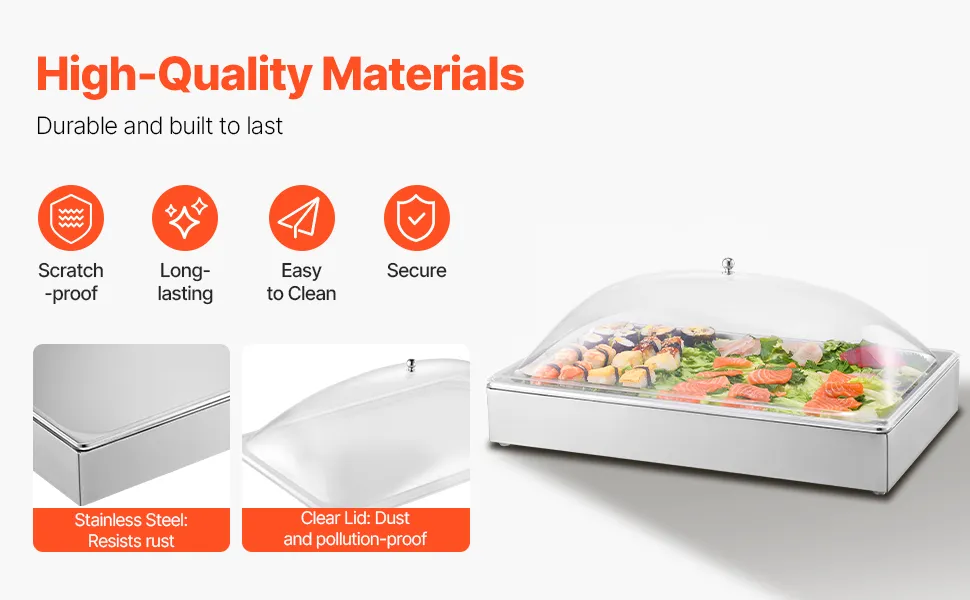 Coperchio superiore trasparente: realizzato in acrilico resistente, il coperchio del nostro espositore per alimenti raffreddato a ghiaccio non solo offre una chiara visibilità del tuo delizioso cibo, ma è anche facile da sollevare e sostituire