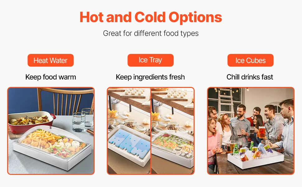 Funzioni di riscaldamento e raffreddamento: basta aggiungere acqua calda, vaschette per il ghiaccio o cubetti di ghiaccio per mantenere la temperatura ideale. Il nostro contenitore espositivo per servire il cibo aiuta a mantenere il cibo caldo o freddo per lunghi periodi, preservandone la freschezza e il sapore ottimale