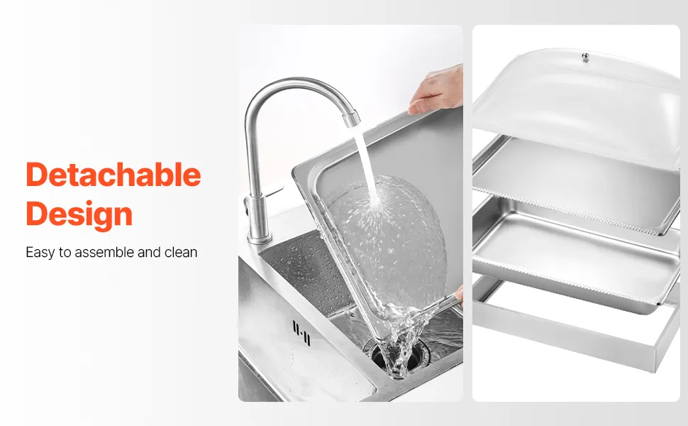 Materiali di prima qualità: sia il vassoio per il cibo che la vaschetta per l'acqua del nostro contenitore espositivo per servire il cibo da banco sono realizzati in acciaio inossidabile di alta qualità per uso alimentare, che soddisfa gli standard di sicurezza con una durata eccezionale