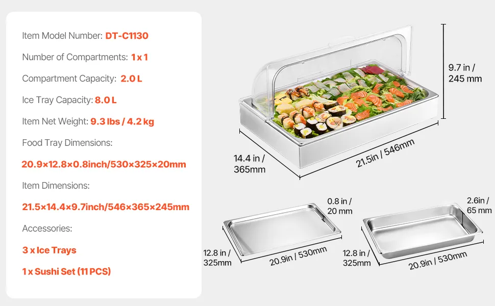 Set elegante e pratico: il nostro espositore per dispensatori di condimenti a buffet include 3 vaschette per ghiaccio e un set per sushi da 11 pezzi. Offre praticità ed eleganza, rendendo le esperienze culinarie più comode ed eleganti