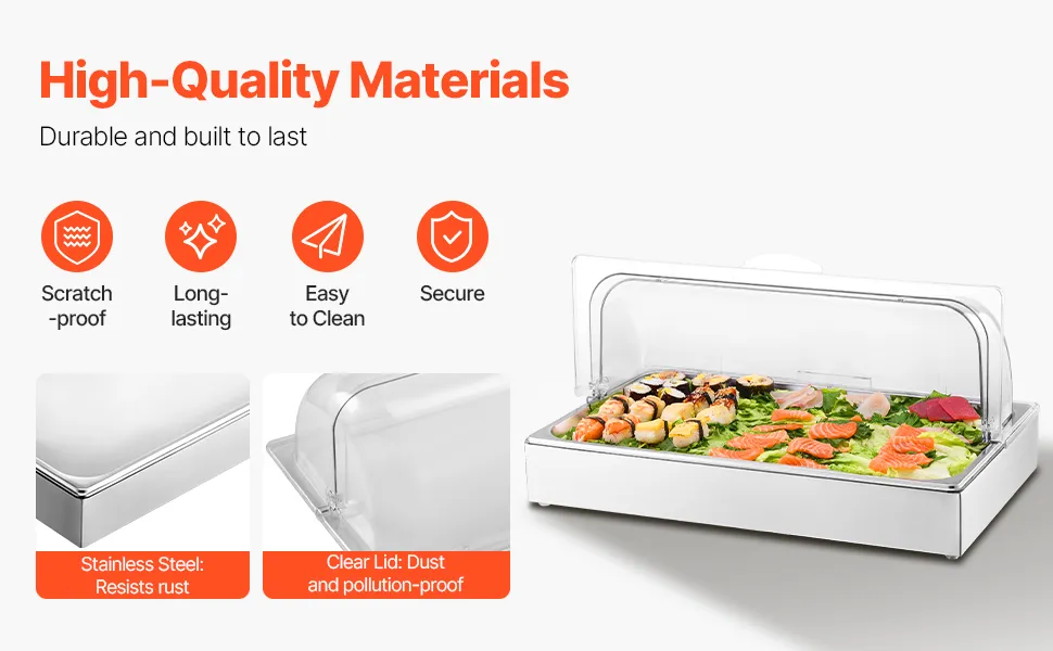 Realizzato in acciaio inossidabile per uso alimentare, il vassoio per alimenti del nostro espositore per alimenti raffreddato a ghiaccio è durevole e facile da pulire. Inoltre, è costruito per resistere agli urti e presenta un coperchio trasparente per una chiara visibilità del cibo.