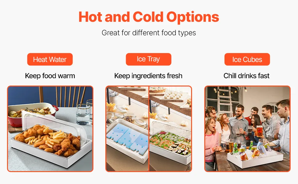 Funzioni di riscaldamento e raffreddamento: basta aggiungere acqua calda, vaschette per il ghiaccio o cubetti di ghiaccio per mantenere la temperatura ideale. Il nostro contenitore espositivo per servire il cibo aiuta a mantenere il cibo caldo o freddo per lunghi periodi, preservandone la freschezza e il sapore ottimale