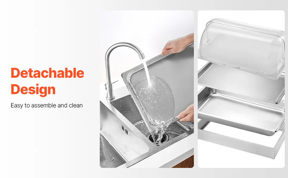 Materiali di prima qualità: sia il vassoio per il cibo che la vaschetta per l'acqua del nostro contenitore espositivo per servire il cibo da banco sono realizzati in acciaio inossidabile di alta qualità per uso alimentare, che soddisfa gli standard di sicurezza con una durata eccezionale