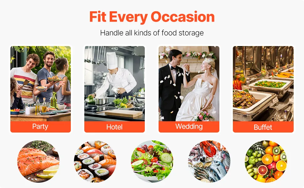 Ampia gamma di utilizzi: ideale per qualsiasi ambiente, sia al chiuso che all'aperto. Il nostro server per buffet di cibi freddi è adatto per pasti in famiglia, feste, picnic, barbecue e campeggio, garantendo una conservazione superiore degli alimenti e una bella esposizione