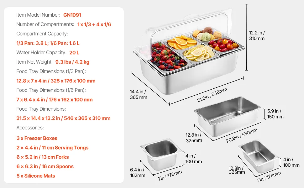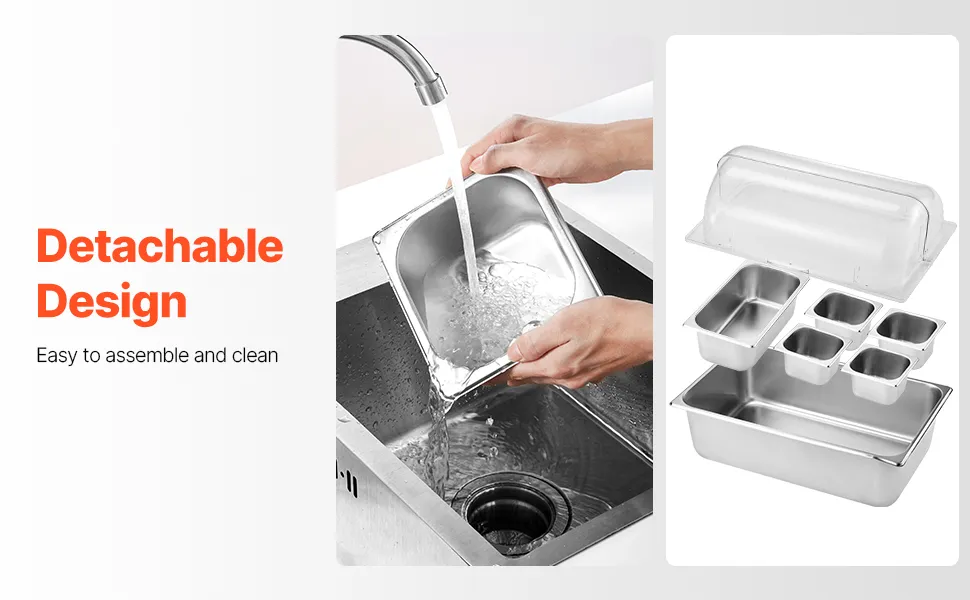 Materiali di prima qualità: sia il vassoio per il cibo che la vaschetta per l'acqua del nostro contenitore espositivo per servire il cibo da banco sono realizzati in acciaio inossidabile di alta qualità per uso alimentare, che soddisfa gli standard di sicurezza con una durata eccezionale