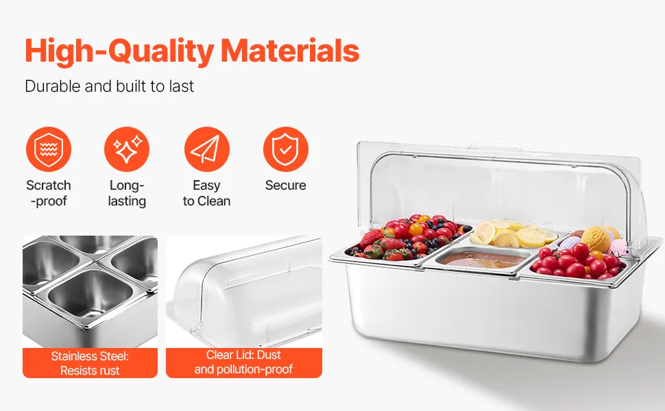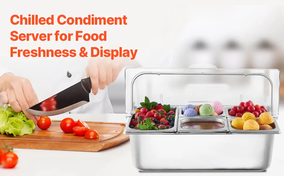 VEVOR Contenitore Espositivo per Servire Cibo da Banco, Vassoio per Servire Cibo in Acciaio Inox 5 Teglie, Espositore per Dispensatori di Condimenti a Buffet con 3 Contenitori per Congelatore