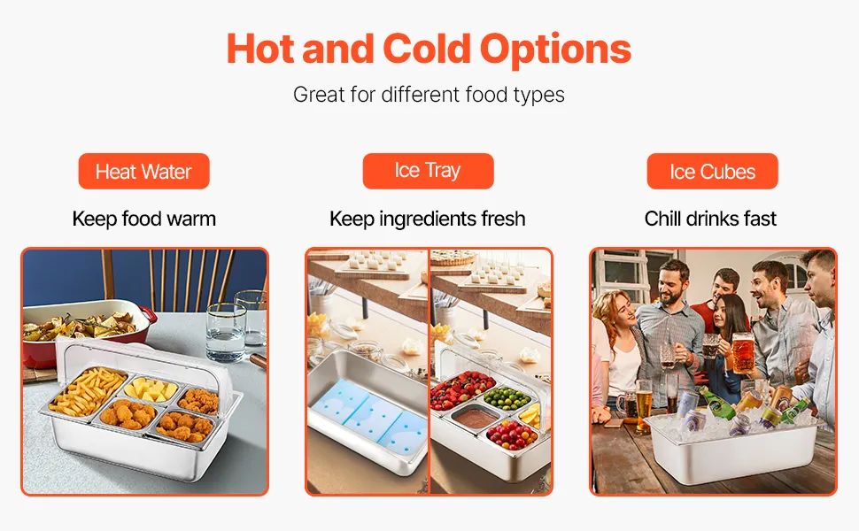 Funzioni di riscaldamento e raffreddamento: basta aggiungere acqua calda, vaschette per il ghiaccio o cubetti di ghiaccio per mantenere la temperatura ideale. Il nostro contenitore espositivo per servire il cibo aiuta a mantenere il cibo caldo o freddo per lunghi periodi, preservandone la freschezza e il sapore ottimale