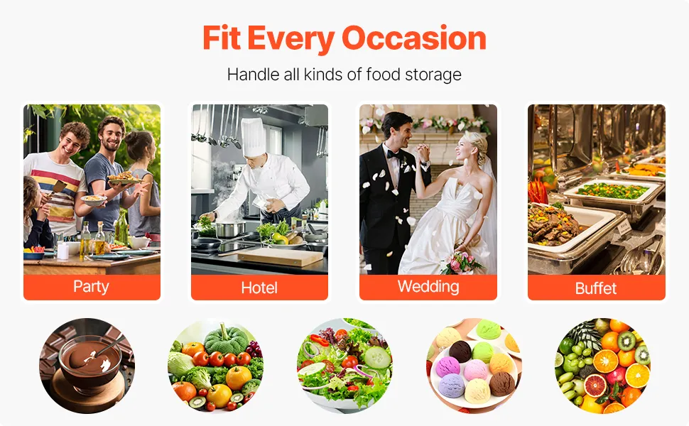 Ampia gamma di utilizzi: ideale per qualsiasi ambiente, sia al chiuso che all'aperto. Il nostro server per buffet di cibi freddi è adatto per pasti in famiglia, feste, picnic, barbecue e campeggio, garantendo una conservazione superiore degli alimenti e una bella esposizione