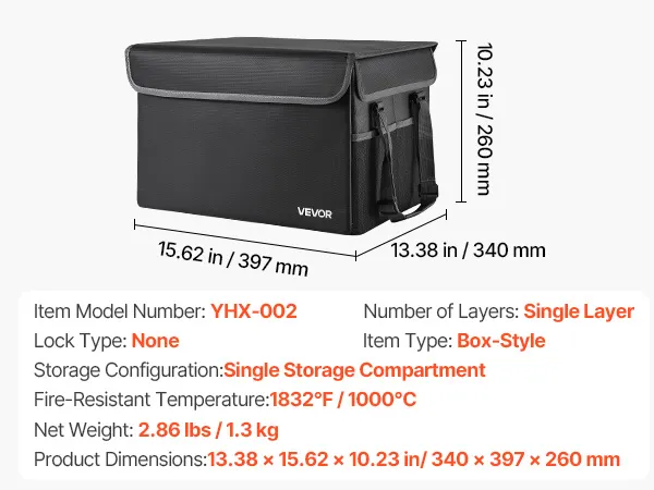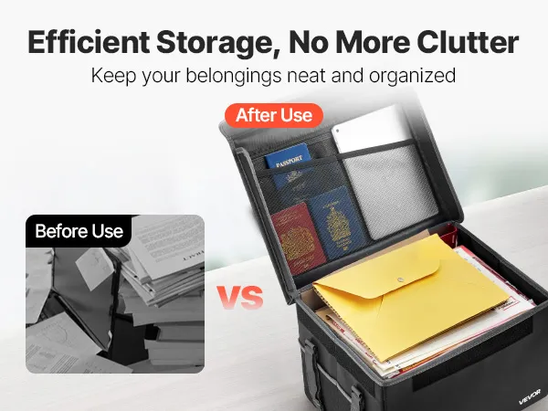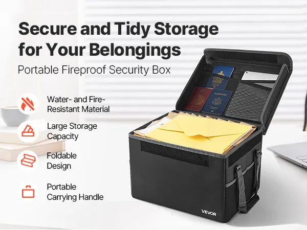 Realizzata in materiale ignifugo, questa scatola resiste a temperature di 1832 ℉/1000 ℃ e blocca acqua e polvere. Il design pieghevole da 2,86 libbre/1,3 kg consente di risparmiare spazio, organizzando al contempo file e dispositivi con uno spazio di archiviazione a strati.
