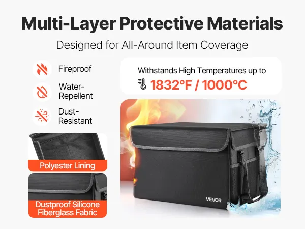 Materiale ignifugo e impermeabile: questa scatola portadocumenti ignifuga è realizzata con materiale ignifugo resistente al calore e fibra di vetro siliconica antipolvere, resistendo a temperature fino a 1832 ℉/1000 ℃
