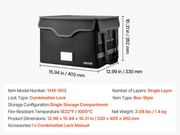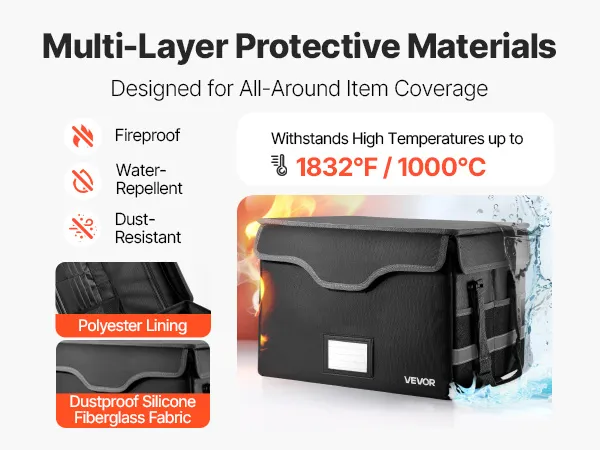 Questa scatola ignifuga è realizzata in tessuto di fibra di vetro siliconica antipolvere con rivestimento in poliestere, resistente fino a 1832 ℉/1000 ℃. Indipendentemente dal fuoco, dalla pioggia o dalla polvere quotidiana, garantisce la sicurezza di documenti ed elettronica.