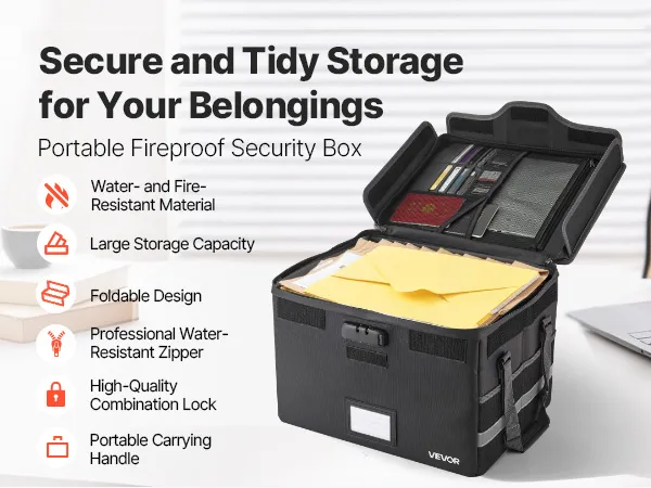 Questa scatola ignifuga resiste a 1000 °C e protegge da acqua e polvere. Con un peso di 1,4 kg, organizza documenti e dispositivi con uno spazio di archiviazione a strati. La serratura a combinazione migliorata e la cerniera impermeabile aggiungono ulteriore sicurezza.