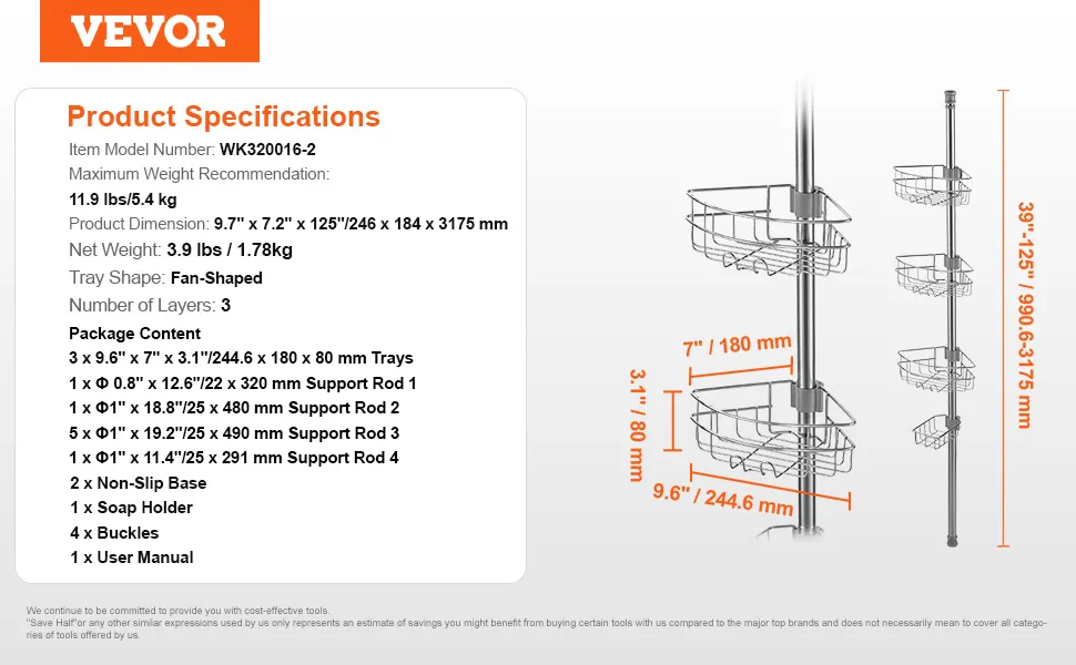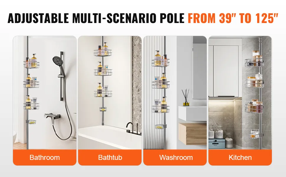 Il palo di tensione regolabile da 39" a 125" può essere regolato in base all'altezza effettiva del tuo bagno, che si tratti di un appartamento alto o di una casa bassa. Nel frattempo, l'organizzatore doccia separato può essere posizionato non solo nel bagno, ma nella vasca da bagno.