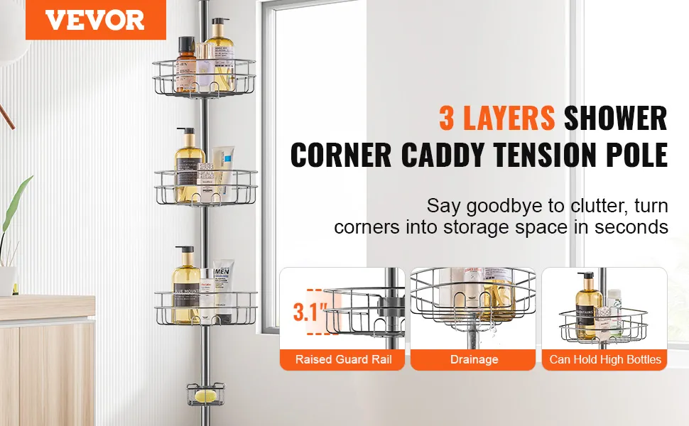 VEVOR Palo di Tensione per Doccia Angolare, 990 mm a 3175 mm di Altezza, 3 Strati, Palo di Tensione per Doccia con Vassoio Portante Robusto, Palo di Tensione Antiruggine Adatto per Bagno, Argento