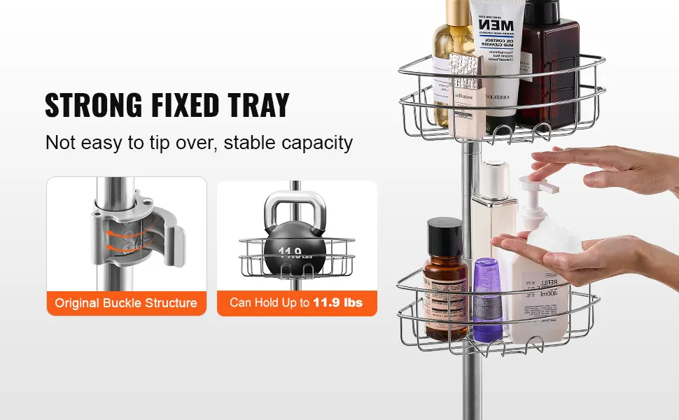 Il design innovativo delle clip rinforzate assicura che il vassoio sia stabile senza scivolare. La sua forte capacità di carico di 11,9 libbre riduce efficacemente al minimo qualsiasi fenomeno di scivolamento o scuotimento durante l'uso del palo di tensione della doccia.