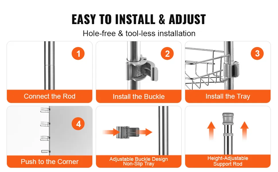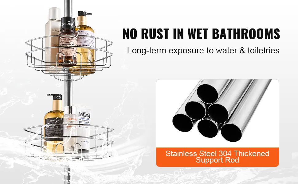 L'organizzatore da bagno del palo di tensione del caddy angolare della doccia è realizzato in acciaio inossidabile di alta qualità, resistente alla corrosione e robusto. Anche se immerso in acqua per un lungo periodo di tempo o in frequente contatto.