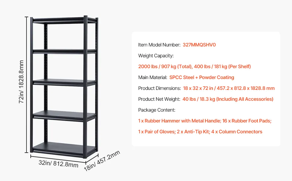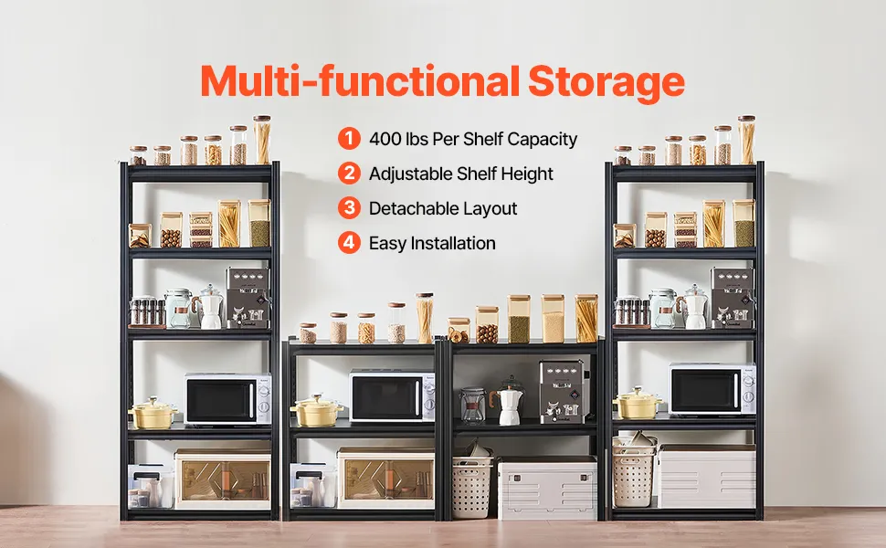 VEVOR Scaffale Portaoggetti,Scaffale Portaoggetti a 5 Livelli, Ripiani in Metallo Regolabili, Scafandro per Cucina, Magazzino, Seminterrato, Scaffalatura Nero 907 kg, 457,2 x 812,8 x 1828 mm