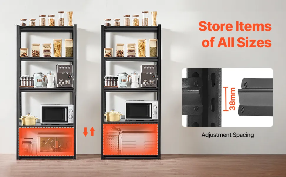 Design flessibile: l'altezza del nostro ripiano in metallo è completamente regolabile con un comodo meccanismo di regolazione rapida. Utilizzando le clip di bloccaggio incluse, puoi regolare i ripiani con incrementi di 38 mm, rendendo facile riporre oggetti di varie dimensioni e massimizzare l'efficienza dello spazio