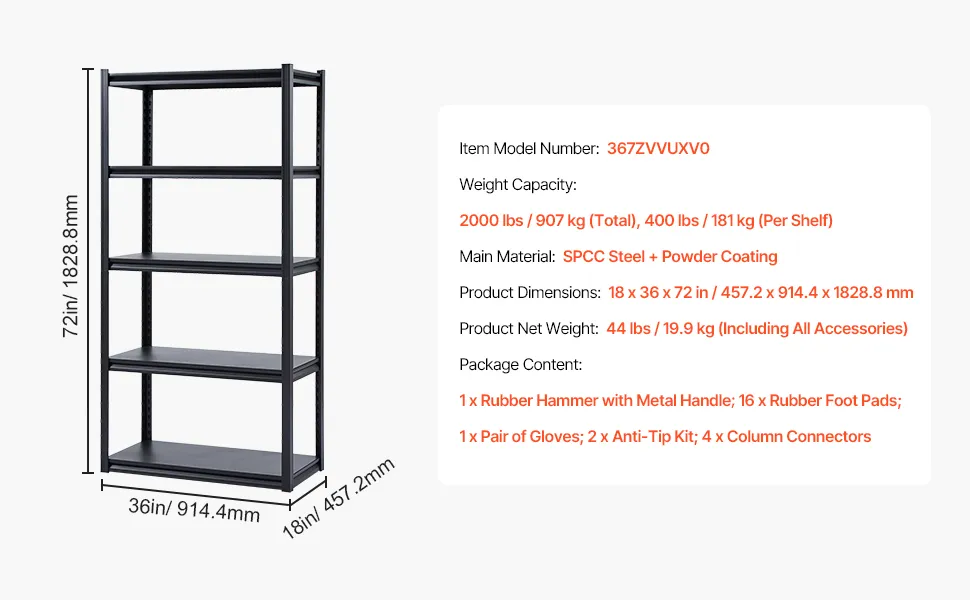VEVOR Scaffale Portaoggetti,Scaffale Portaoggetti a 5 Livelli, Ripiani in Metallo Regolabili, Scafandro per Cucina, Magazzino, Seminterrato, Scaffalatura Nero 907 kg, 457,2 x 914 x 1828 mm