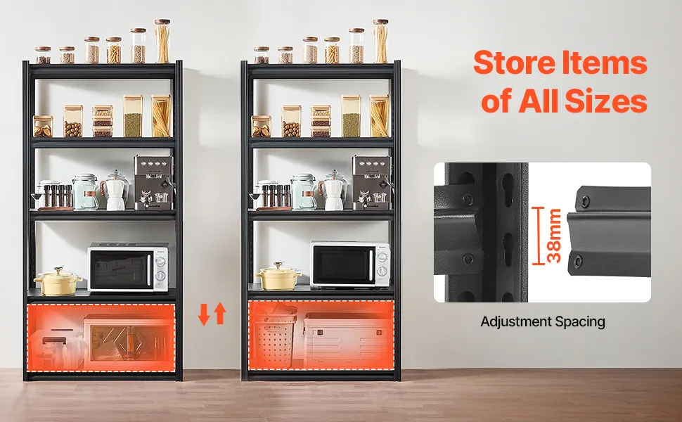 Design flessibile: l'altezza del nostro ripiano in metallo è completamente regolabile con un comodo meccanismo di regolazione rapida. Utilizzando le clip di bloccaggio incluse, puoi regolare i ripiani con incrementi di 38 mm, rendendo facile riporre oggetti di varie dimensioni e massimizzare l'efficienza dello spazio
