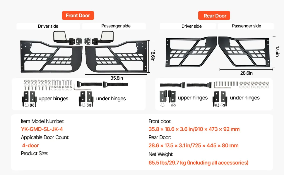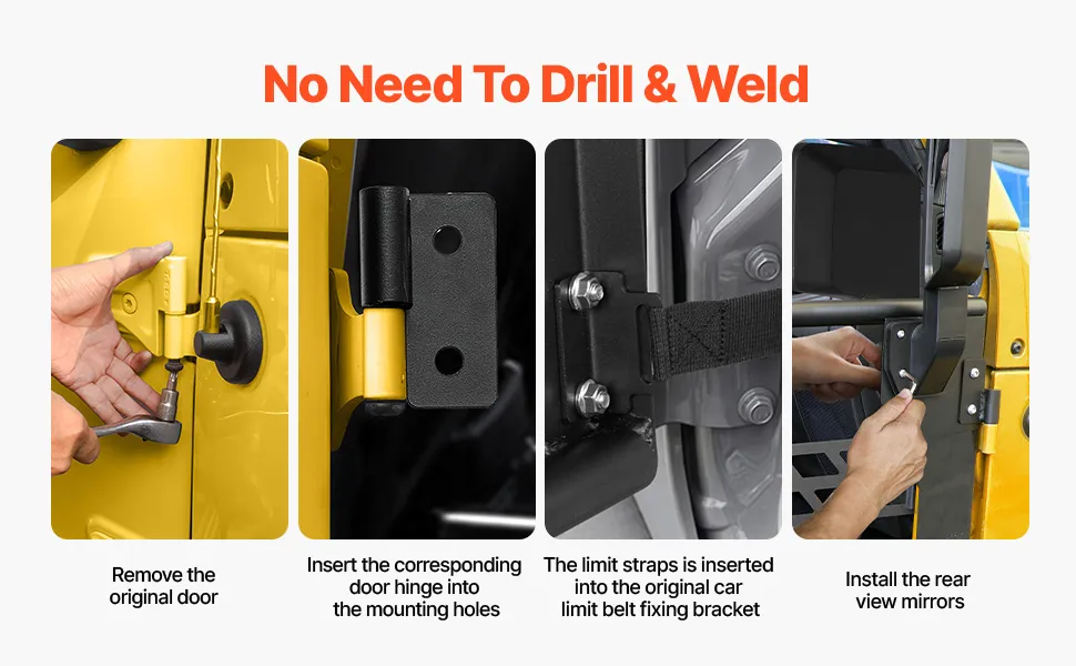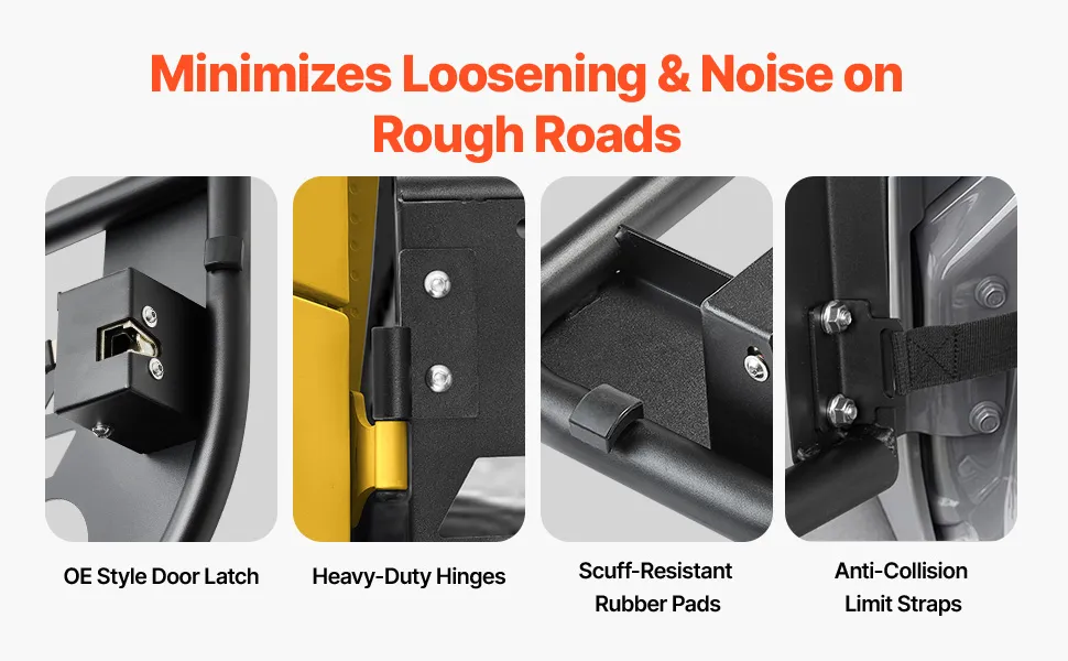 Facile installazione: dotate di cerniere resistenti, queste porte tubolari per jeep non richiedono forature o saldature, consentendo un'installazione senza problemi sulle cerniere delle porte di fabbrica. Le cinghie di limitazione in nylon incluse evitano l'eccessiva estensione