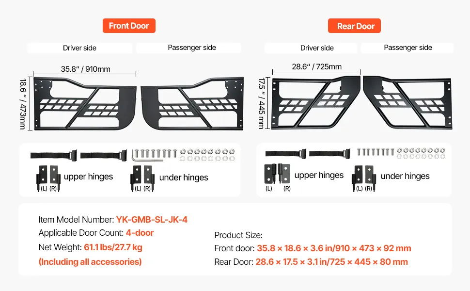 Compatibilità: Progettate per la Jeep Wrangler JK 2007-2018, queste porte tubolari in stile hunting si adattano sia al lato anteriore che posteriore del conducente e del passeggero. Il set completo di quattro porte migliora la visibilità e il flusso d'aria nell'abitacolo
