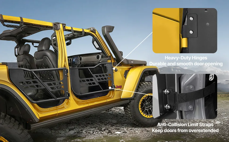 Dotate di resistenti cinghie di limitazione in nylon, queste porte tubolari per jeep evitano oscillazioni eccessive, riducendo il rischio di collisioni o movimenti indesiderati. Le cerniere resistenti assicurano una vestibilità precisa e un funzionamento fluido e affidabile.