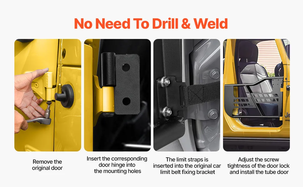 Facile installazione: dotate di cerniere resistenti, queste porte tubolari per jeep non richiedono forature o saldature, consentendo un'installazione senza problemi sulle cerniere delle porte di fabbrica. Le cinghie di limitazione in nylon incluse evitano l'eccessiva estensione