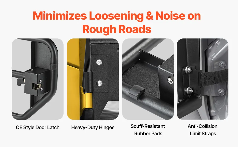 Dotate di chiusure OE, queste porte tubolari per jeep si integrano perfettamente con le serrature delle porte di fabbrica per un facile utilizzo sia dall'interno che dall'esterno. I cuscinetti in gomma evitano graffi durante l'apertura e la chiusura.