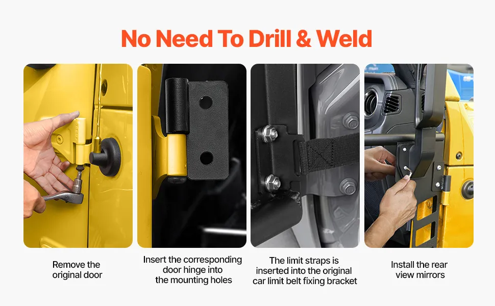 Facile installazione: dotate di cerniere resistenti, queste porte tubolari per jeep non richiedono forature o saldature, consentendo un'installazione senza problemi sulle cerniere delle porte di fabbrica.