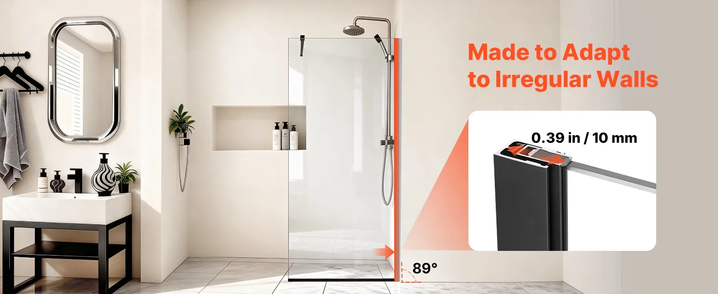 Elegante telaio in lega di alluminio con barra di supporto: La parete da doccia in vetro fisso è dotato di un telaio in lega di alluminio di alta qualità e di una barra di supporto tagliabile, che garantisce un'installazione stabile, una maggiore durata e prestazioni durature senza oscillazioni o piegature
