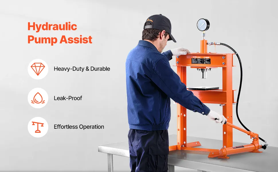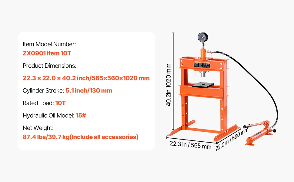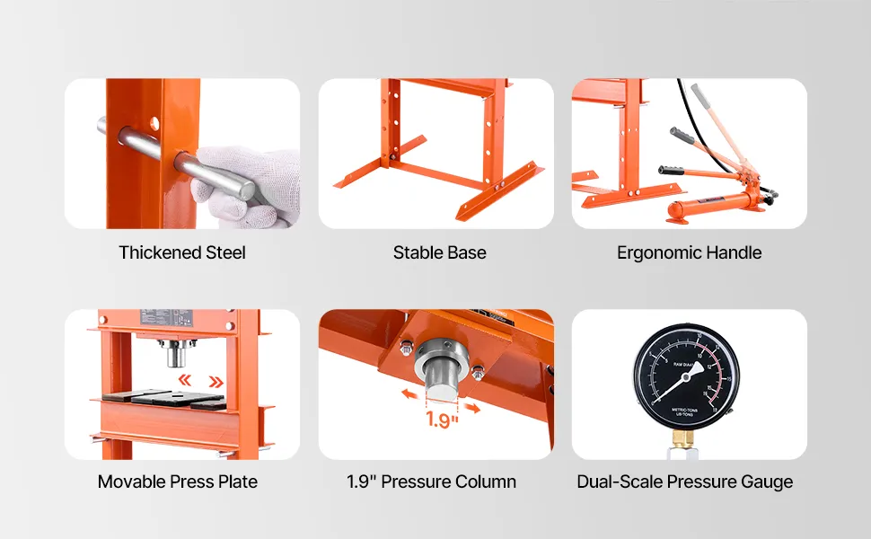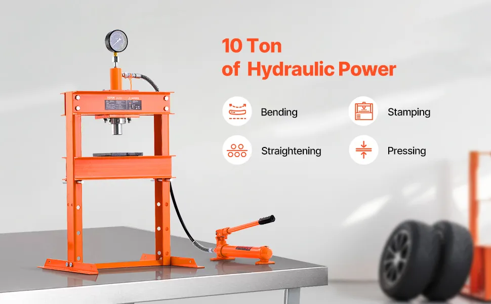 Capacità di carico di 10 tonnellate: la nostra pressa idraulica ti aiuta a smontare e installare facilmente boccole per autoveicoli, giunti sferici, giunti a U e altro ancora, nonché a raddrizzare, piegare e stampare parti metalliche