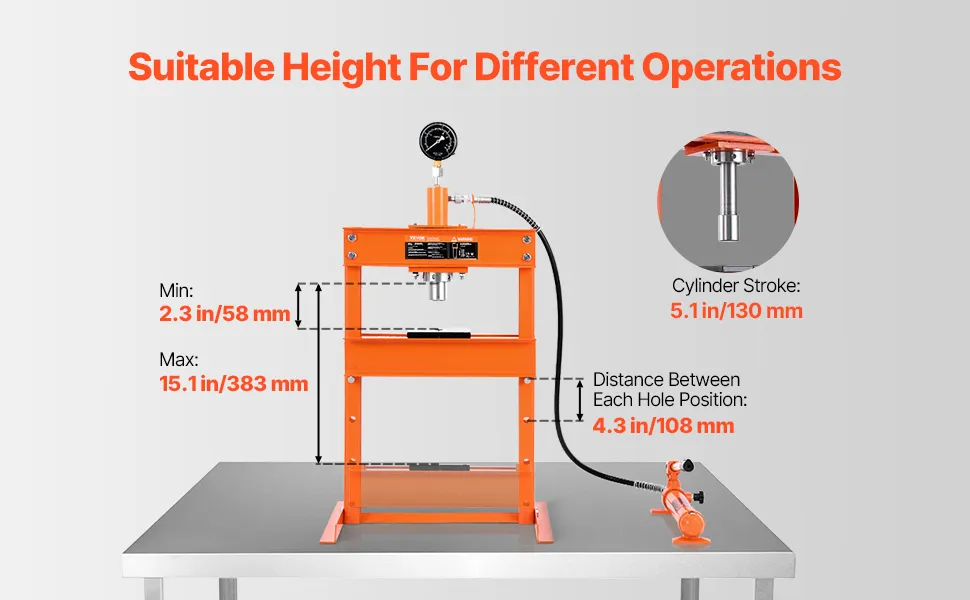 Altezza regolabile: il tavolo da lavoro della pressa idraulica da officina è dotato di un sistema di perni a regolazione rapida con 4 impostazioni di altezza, che vanno da 2,3 a 15,1 pollici (58-383 mm). Nota: il superamento dell'intervallo di corsa del cilindro può causare danni alle guarnizioni del cilindro.