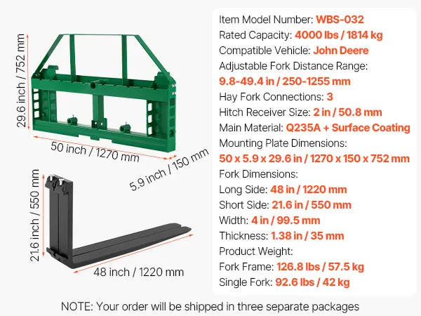 Capacità di carico elevata di 4000 libbre: le nostre forche per minipale per impieghi gravosi (piastra di montaggio: 45 x 5,9 x 29,6 pollici; lunghezza forca: 48 pollici) supportano fino a 4000 libbre. Ideali per aziende agricole, magazzini