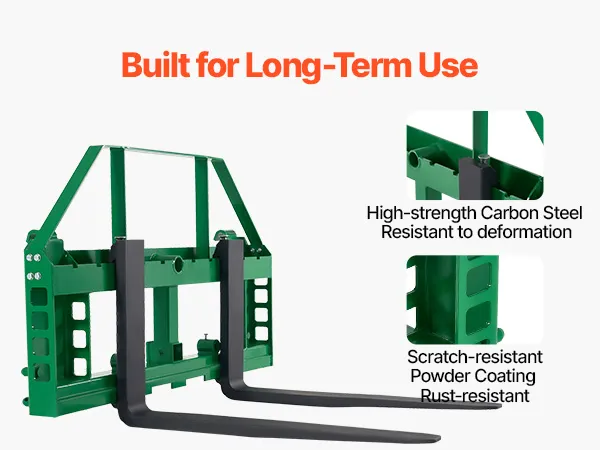 Costruzione in acciaio resistente: costruita per durare. Le nostre forche per pallet e la piastra di montaggio per minipale sono realizzate in acciaio al carbonio ad alta resistenza, con rivestimento anticorrosione e antiruggine
