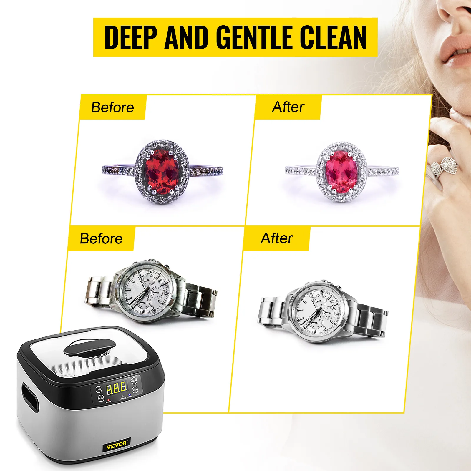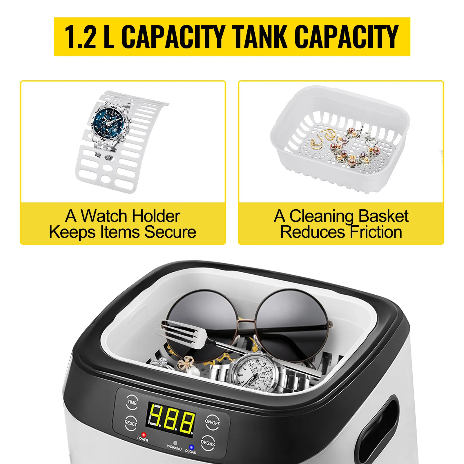 Il detergente per gioielli è dotato di un serbatoio da 1,2 litri, dotato di un cestello per la pulizia per ridurre l'attrito durante il lavaggio e un supporto per orologi senza immersione.
