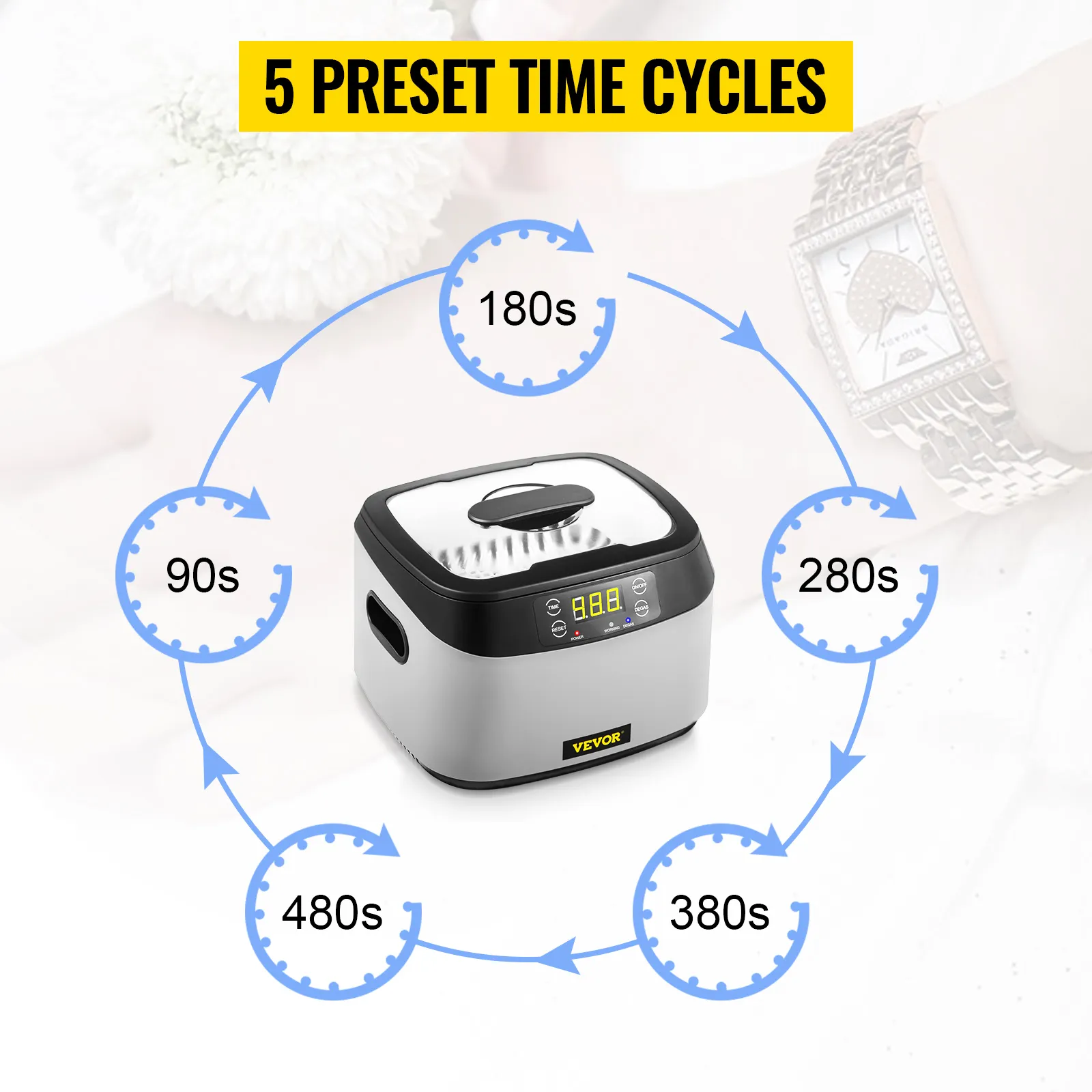 • Pannello di Controllo Digitale Touch: la macchina per la pulizia a ultrasuoni ha 5 diversi cicli tra cui scegliere (90, 180, 280, 380 e 480 secondi), a seconda del tempo di pulizia richiesto, per 4 pulsanti, controllo facile e preciso. Basta selezionare l'ora desiderata e guardare il display digitale contare alla rovescia fino alla fine della pulizia e poi spegnersi automaticamente.