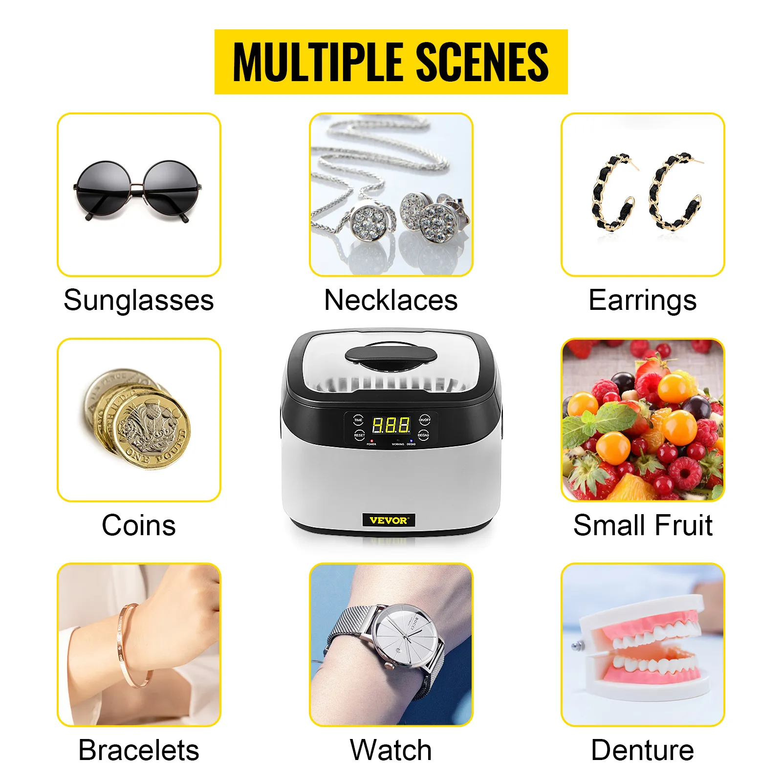Perfetto per uso domestico o professionale, il nostro detergente per protesi è ampiamente utilizzato per pulire frutta, verdura, gioielli, occhiali, orologi, utensili in metallo, dentiere, testine di rasoio, ecc.