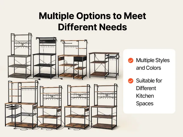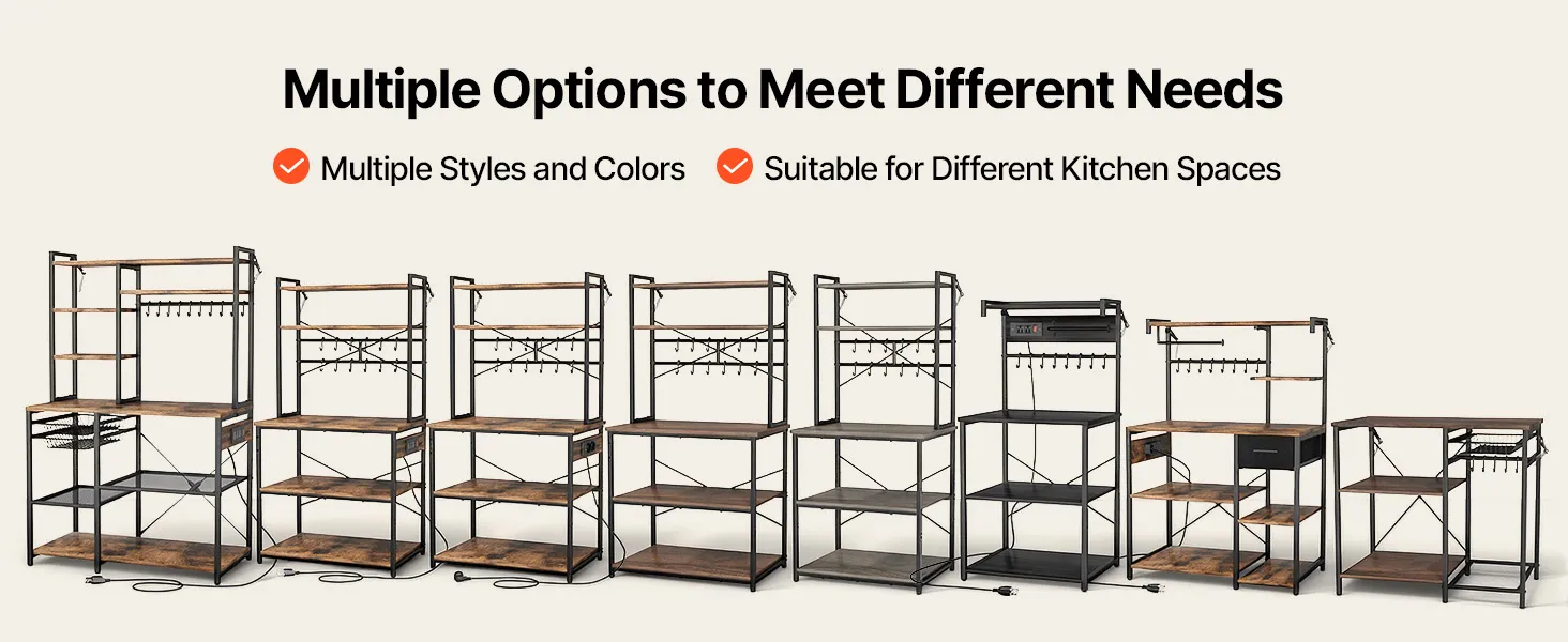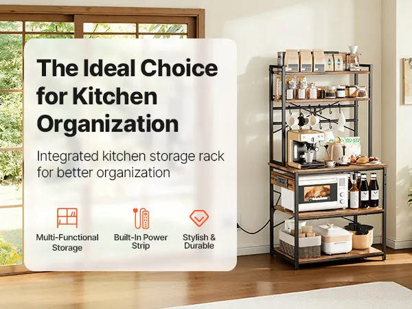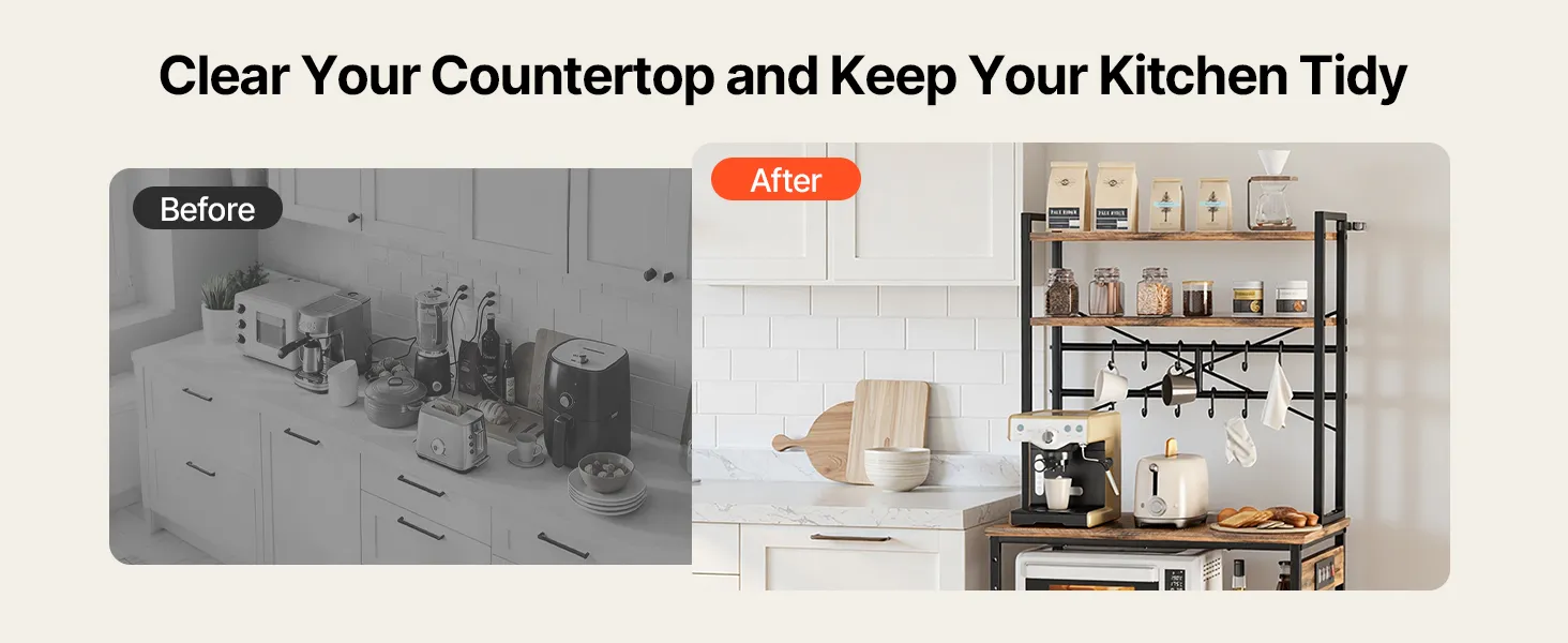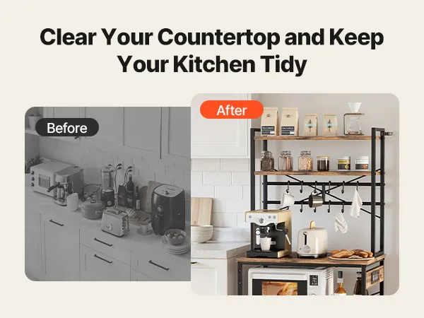 Progettato con ripiani e tre livelli di altezza regolabili (8-9 cm ciascuno), questo scaffale da cucina offre soluzioni di stoccaggio flessibili. Il ripiano superiore è dedicato alla preparazione dei cibi, i ripiani inferiori organizzano gli elettrodomestici e i ganci offrono spazio per piccoli oggetti.
