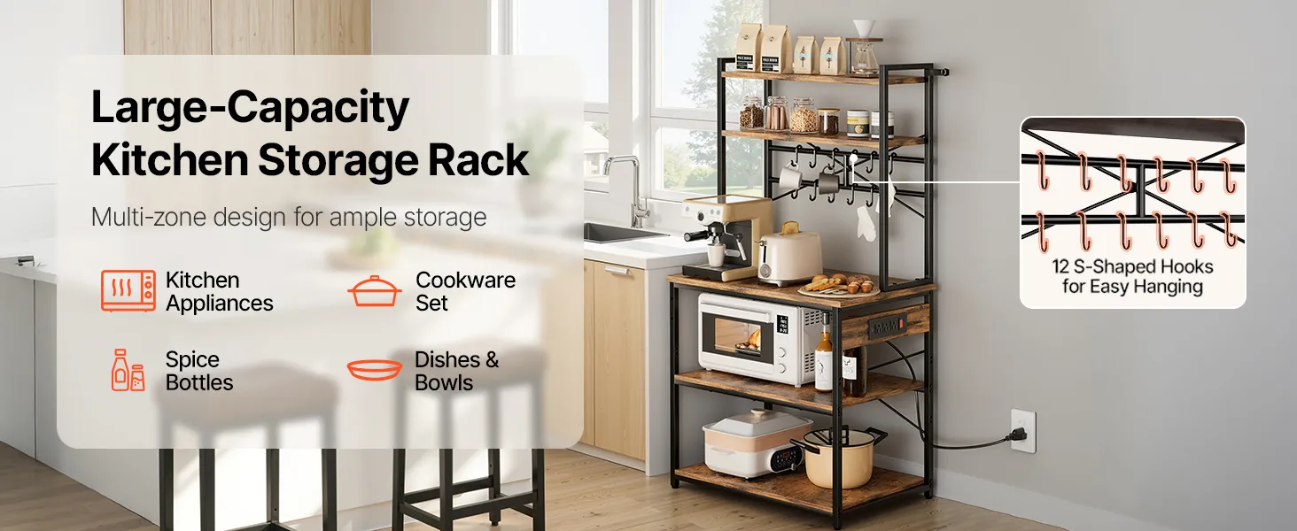 VEVOR Scaffale da Cucina Portaoggetti Microonde Utensili da Cucina 80x40x161,8 cm Scaffale Multipresa Integrata Cavo da 1,5 m Supporto con Ripiani da Bar Ristorante, Porta Spezie Scolapiatti Ganci
