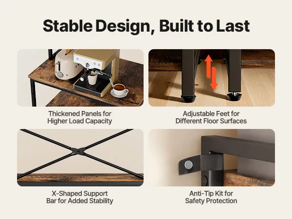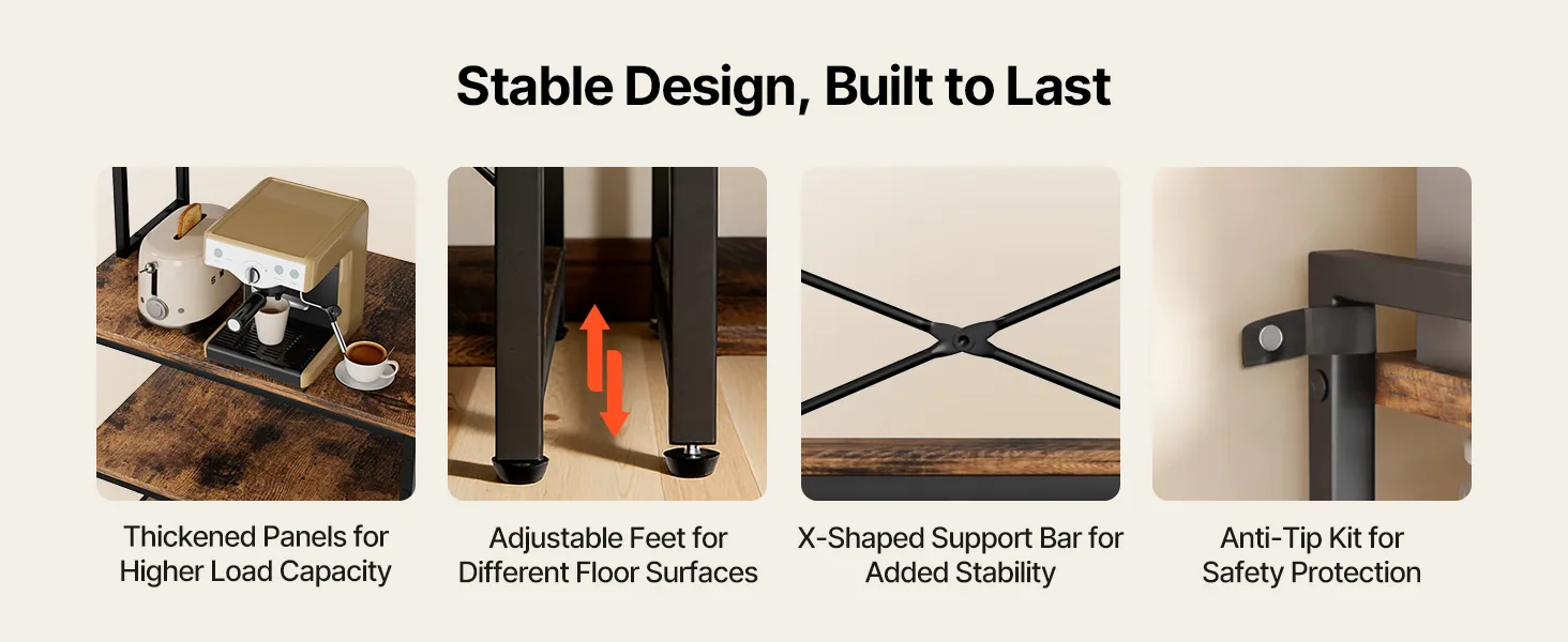 Stabilità a tre livelli: Questo ripiano da cucina indipendente presenta un design a tripla stabilità, che include un ancoraggio a parete antiribaltamento superiore, un rinforzo in ferro a forma di X sul retro e quattro piedini regolabili