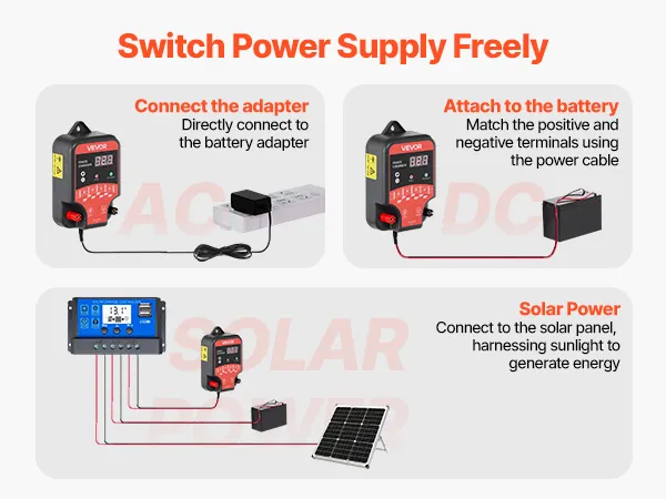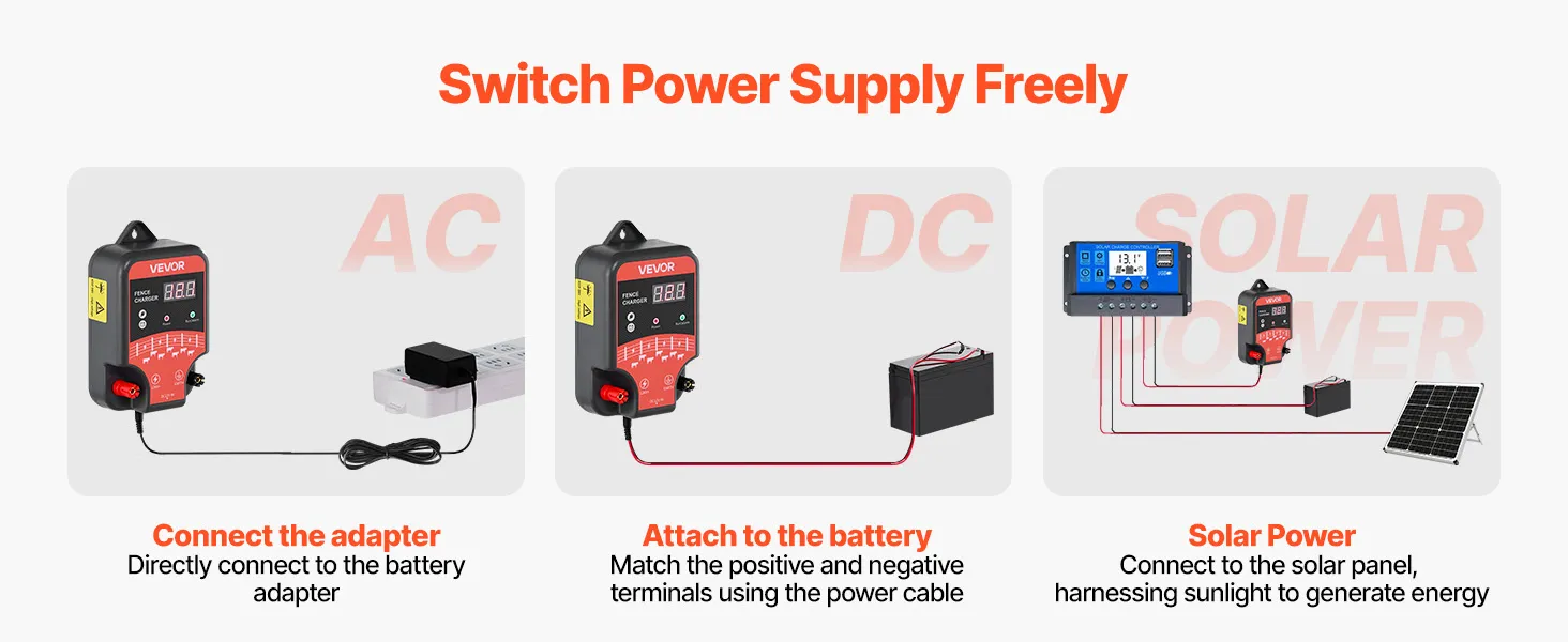 Molteplici opzioni di alimentazione: questo elettrificatore per recinzione elettrica supporta alimentazione a batteria CA, CC (batteria al litio esterna) e solare, garantendo un funzionamento affidabile sia in aree alimentate dalla rete che fuori dalla rete