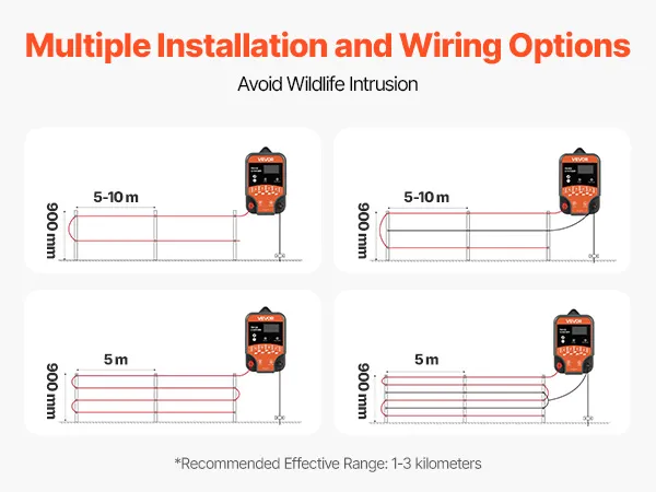 Questo sistema copre una distanza di 1-3 km, adatto per evitare intrusioni di animali selvatici come orsi e procioni. Le diverse configurazioni di cablaggio offrono flessibilità, garantendo la sicurezza ottimale per aziende agricole e allevamenti.